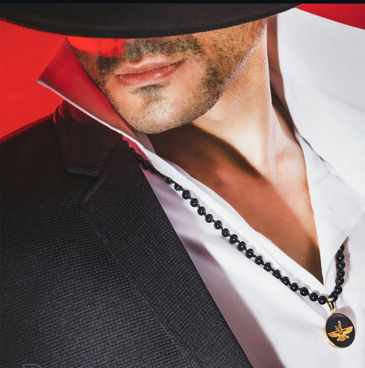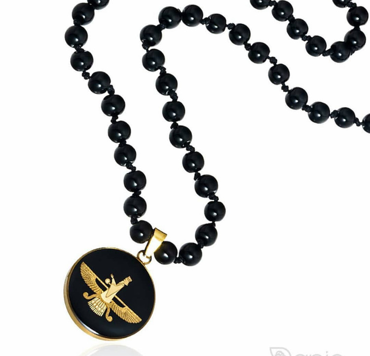 گردنبند با طرح فروهر، نماد پیکر بالداری که در بالهای شاهین احاطه شده و با استفاده از ورق طلای 24 عیار ساخته شده است و بر روی زمینه ی مشکی جلوه ی زیبایی دارد.
