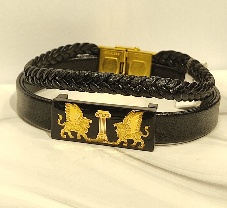قاب پلاک این دستبند از جنس استیل ضد زنگ و ضد حساسیت می باشد که دارای رنگ ثابت است. طرح درون پلاک نماد شیر است که از ورق های نازک طلا 24 عیار ساخته شده اند و بر روی زمینه ی مشکی قرار گرفته است.