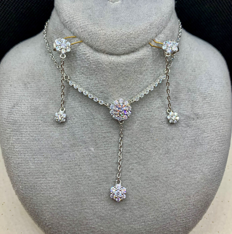 نیم ست نقره زنانه طرح فلاور نگین اتمی مخراج کاری شده. این محصول دارای آبکاری رودیوم و طلا سفید است که به همین دلیل ضد حساسیت و رنگ ثابت میباشد.