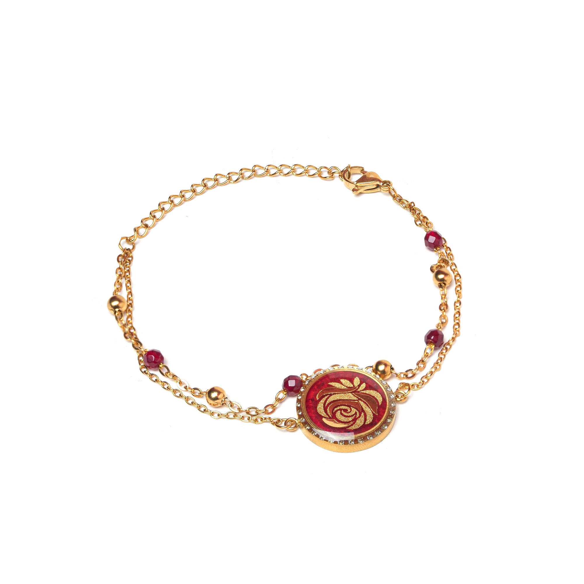 دستبند زنجیرسنگ رزگلد با استفاده از ورق طلای 24 عیار و سنگ عقیق سرخ ساخته شده است.