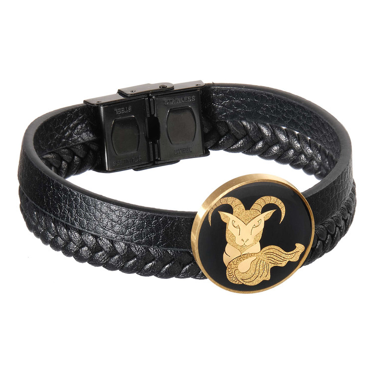 قاب پلاک این دستبند از جنس استیل ضد زنگ و ضد حساسیت می باشد که دارای رنگ ثابت است. طرح درون پلاک سمبل ماه دی است که از ورق های نازک طلا 24 عیار ساخته شده اند و بر روی زمینه ی مشکی یا قهوه ای قرار گرفته است.