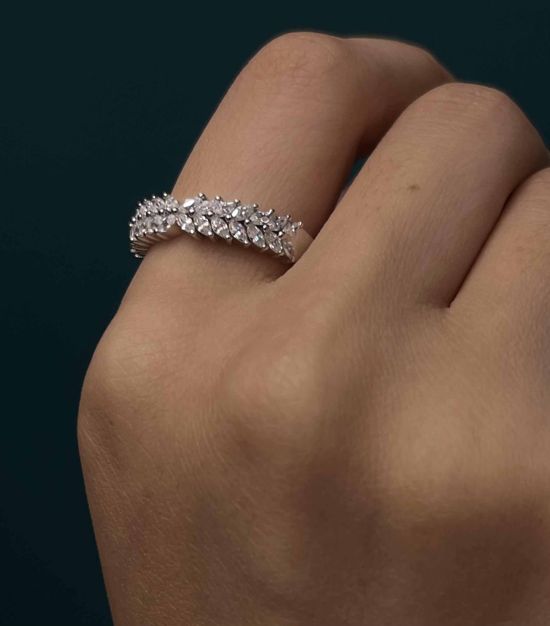انگشتر نقره زنانه خوشه ای نگین مارکیز، این محصول دارای آبکاری رودیوم و طلا سفید میباشد.