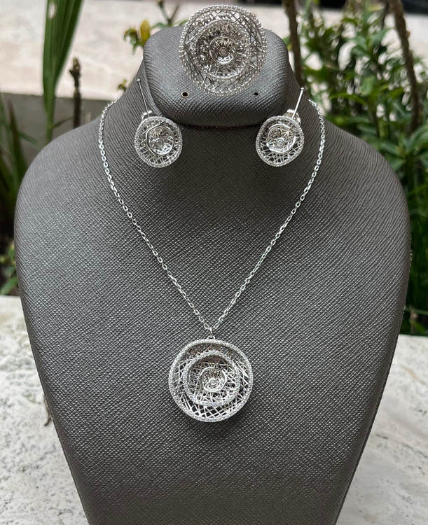 نیم ست نقره زنانه . این محصول دارای آبکاری رودیوم و طلا سفید است که به همین دلیل ضد حساسیت و رنگ ثابت است.