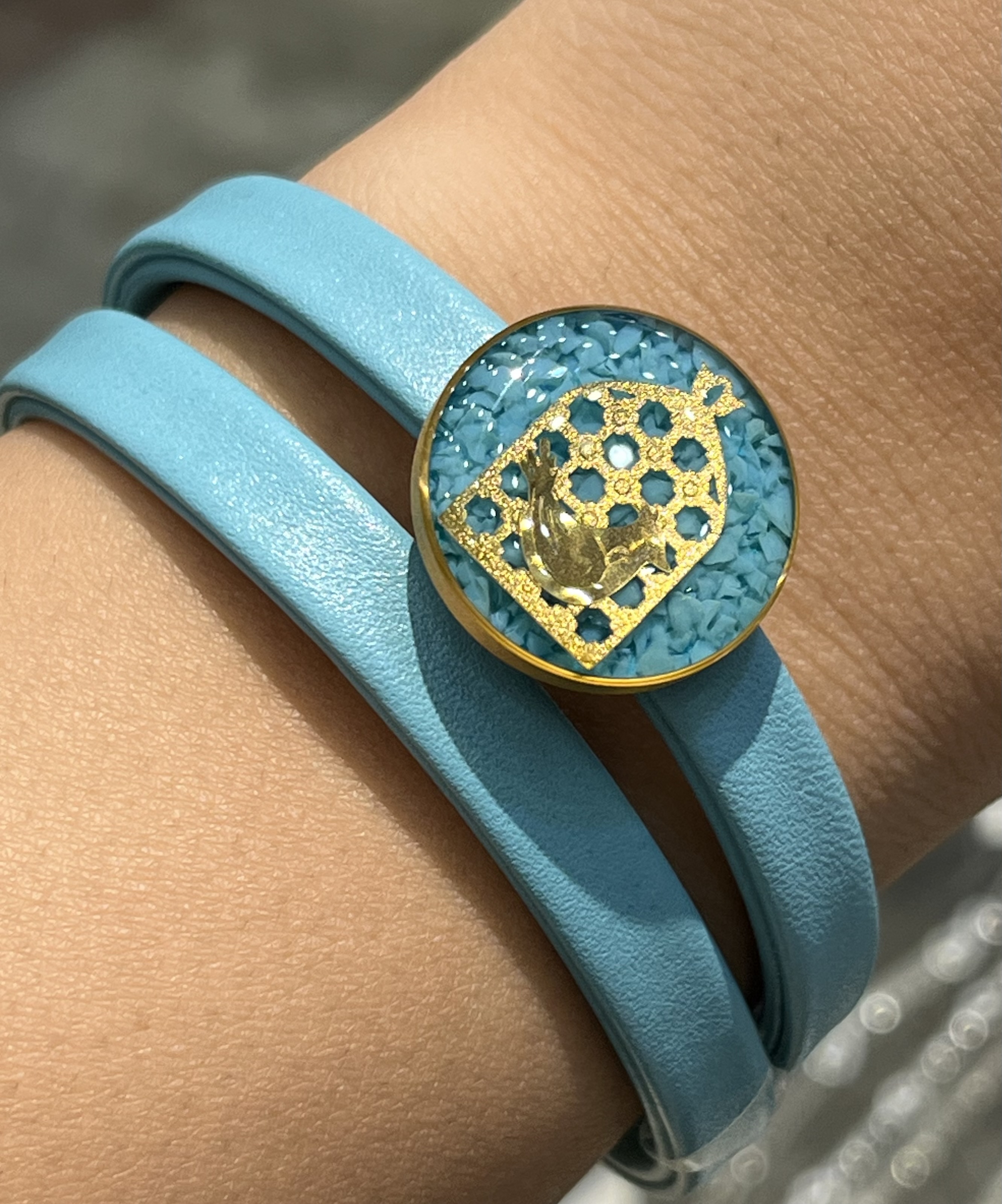 دستبند ورق طلا چرمی دو دور مرغ آمین. طرح داخل این محصول از ورق طلای 24 عیار و قالب آن از استیل316 میباشد که به همین دلیل ضد حساسیت و رنگ ثابت است.