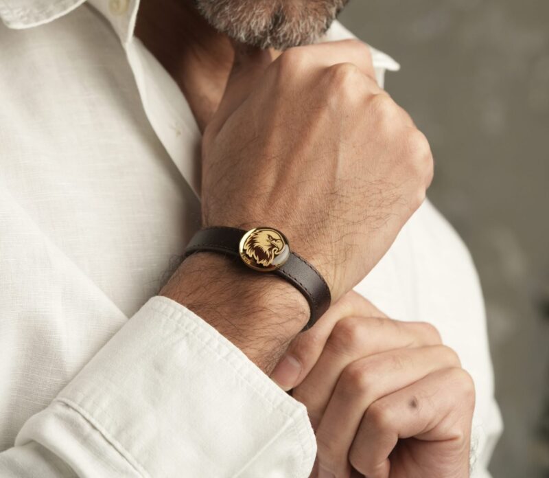 دستبند ورق طلا چرم عقاب . طرح داخل این محصول از ورق طلای 24 و جنس قالب آن از استیل 316 میباشد که به همین دلیل ضد حساسیت و رنگ ثابت است.