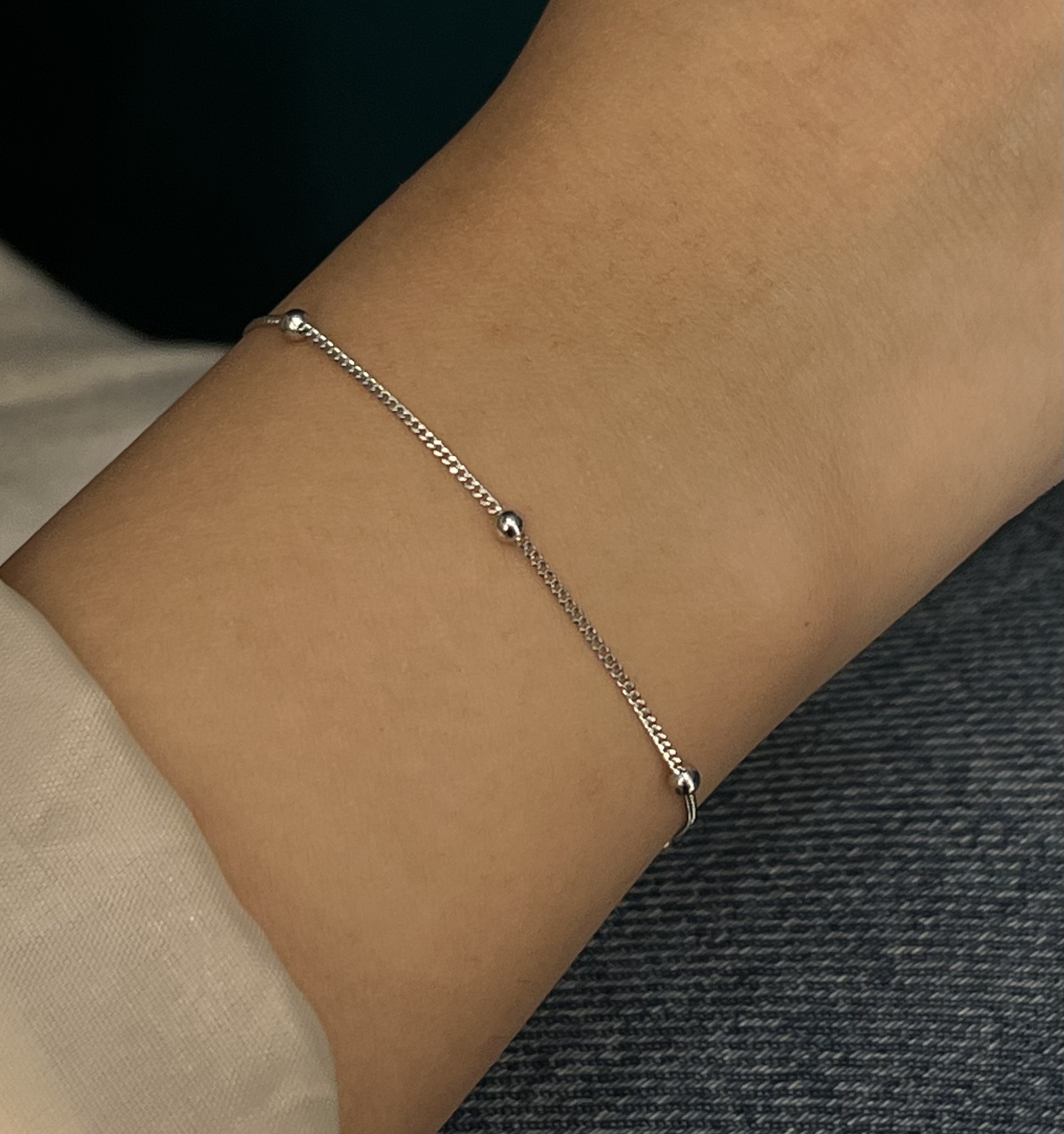 دستبند نقره زنانه ساچمه ای ظریف ، این محصول دارای آبکاری رودیوم و طلا سفید میباشد که به همین دلیل ضد حساسیت و رنگ ثابت میباشد. عیار نقره این محصول 925 میباشد.