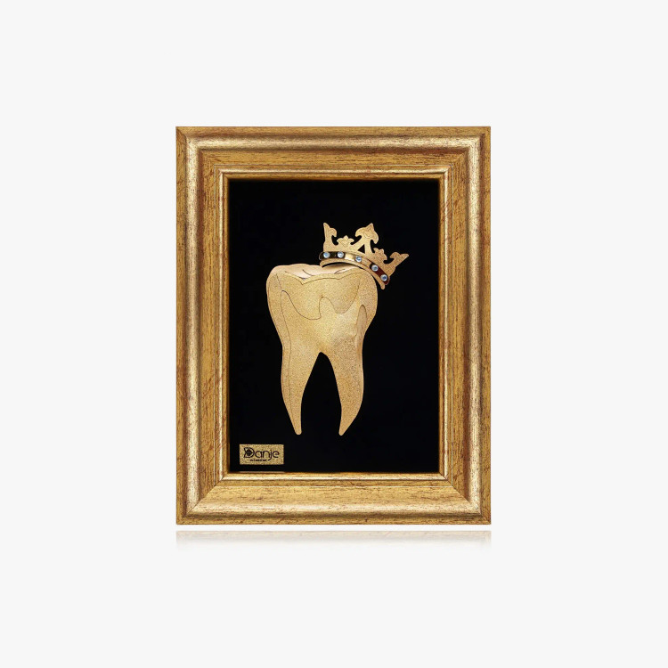 تابلو دندان تاج دار. طرح داخل این محصول از ورق طلای 24 عیار است که به همین منظور دارای ثبات رنگی میباشد و تغییر رنگ نمیدهد.