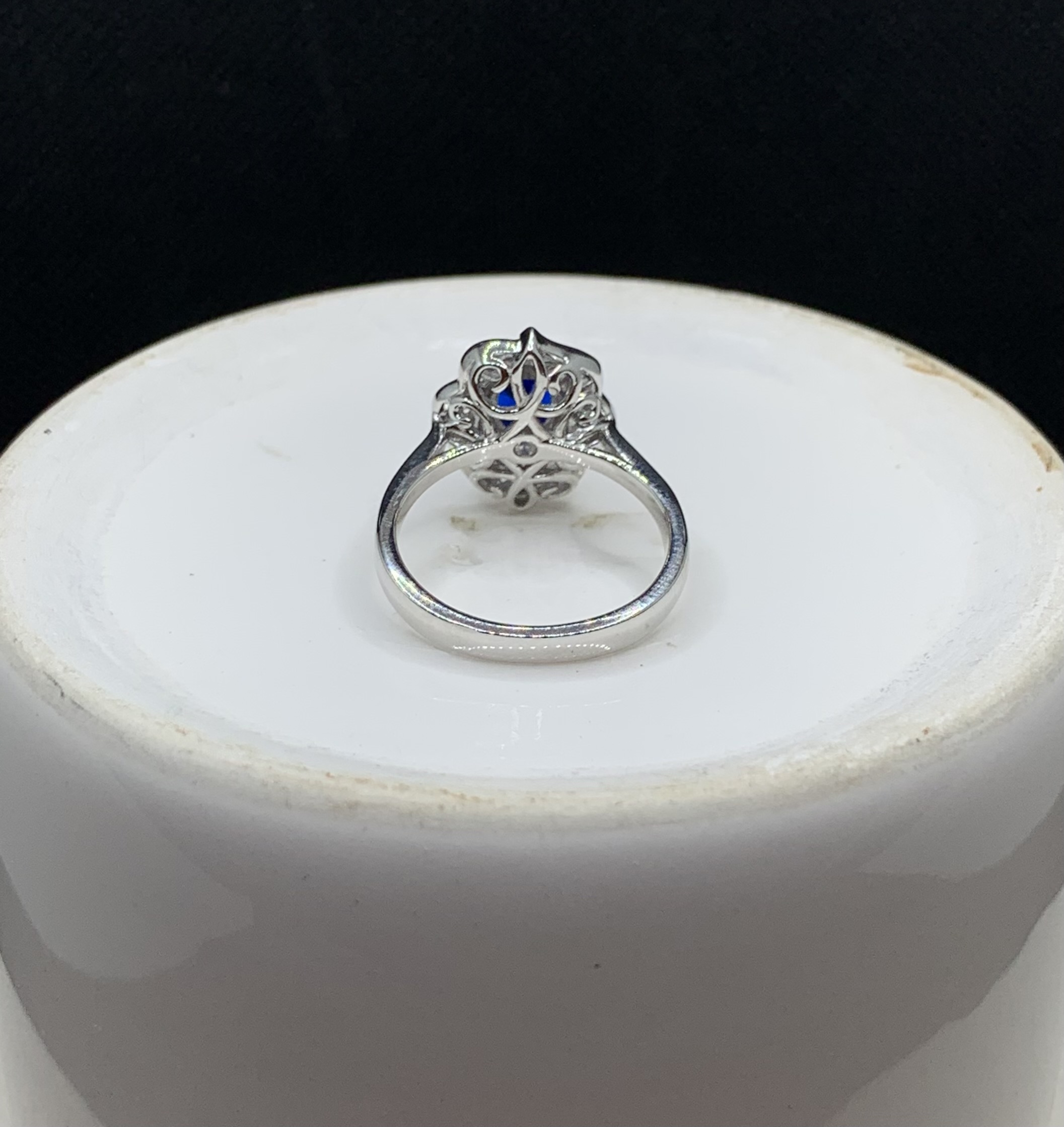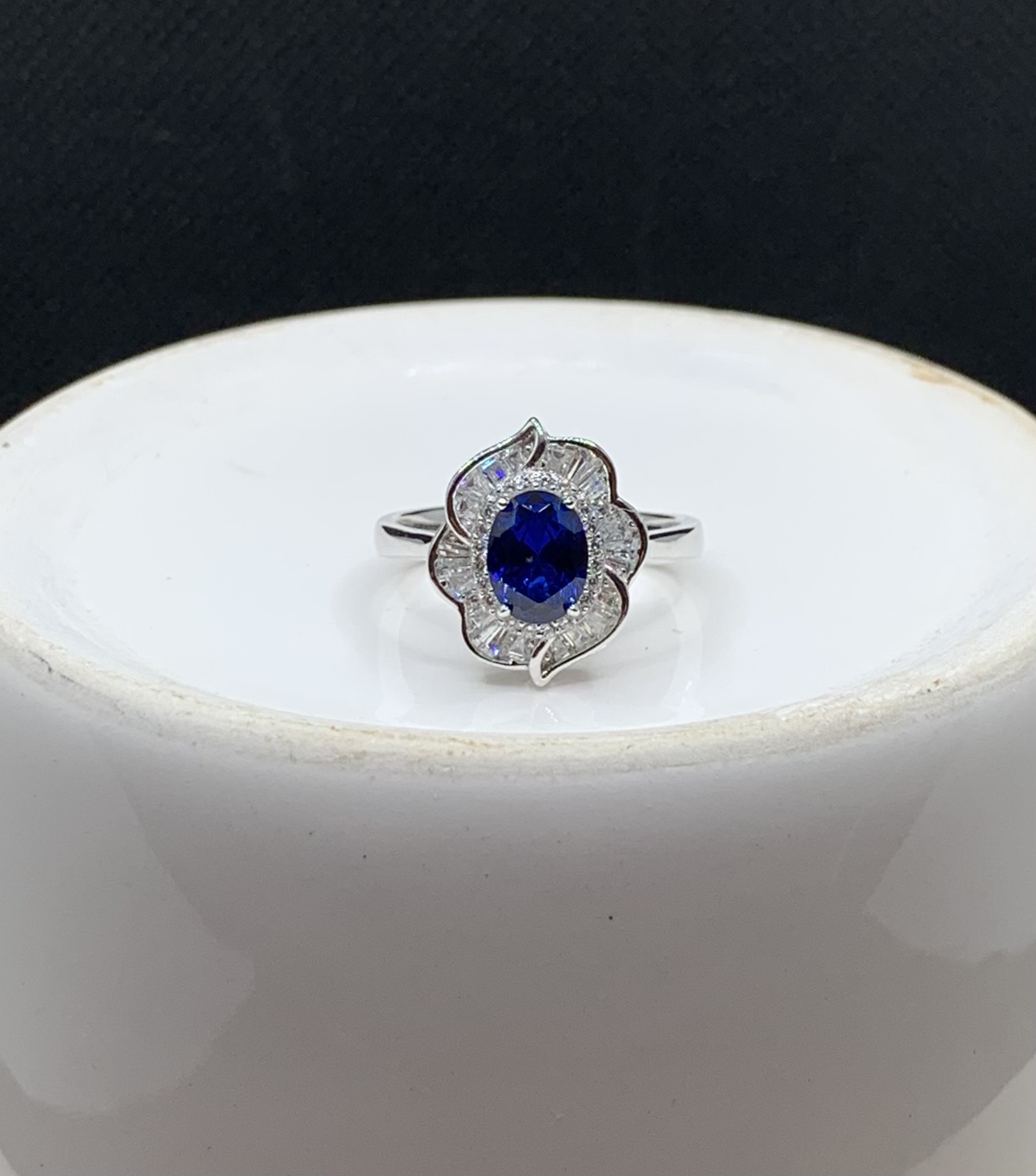 انگشتر نقره زنانه یاقوت کبود اتمی دور نگین باگت، این محصول دارای آبکاری رودیوم و طلا سفید میباشد.