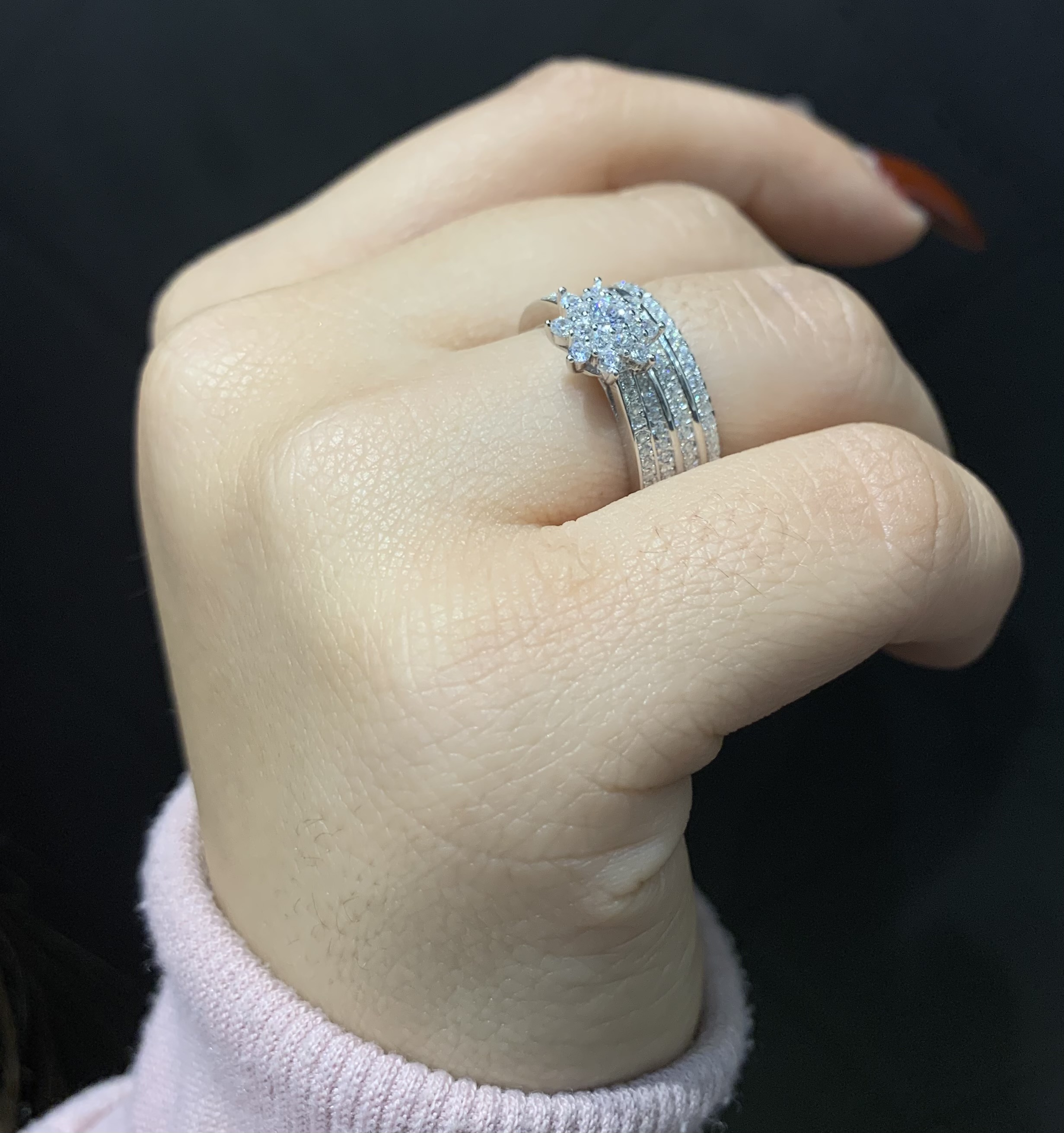 انگشتر نقره زنانه حلقه پشت حلقه فلاور نگینی، این محصول دارای آبکاری رودیوم و طلا سفید میباشد.