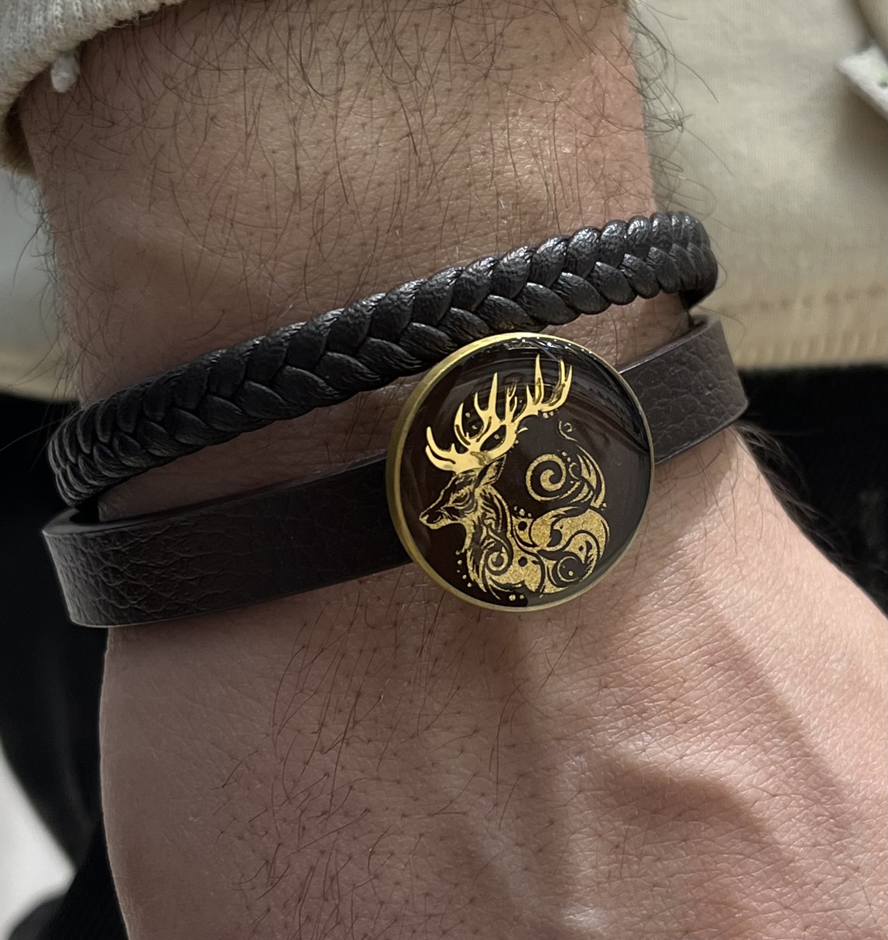 قاب پلاک این دستبند از جنس استیل ضد زنگ و ضد حساسیت می باشد که دارای رنگ ثابت است. طرح درون پلاک از ورق های نازک طلا 24 عیار ساخته شده اند و بر روی زمینه ی قهوه ای قرار گرفته است.