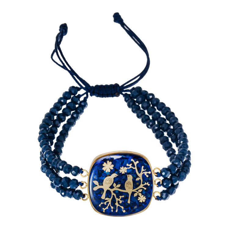 دستبند گلستان با طرح گل و مرغ به معنای گلستان و با استفاده از ورق طلای 24 عیار و سنگ عقیق سرمه ای ساخته شده است.