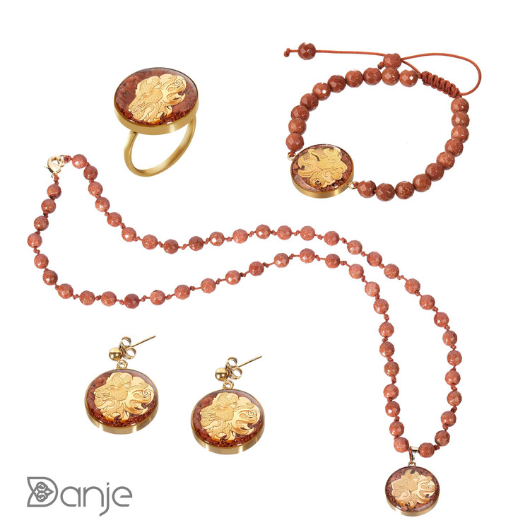 قاب محصولات همگی از استیل ضد حساسیت با رنگ ثابت ساخته شده اند. طرح درون قاب این انگشتر سمبل ماه مرداد است که از ورق های نازک طلا 24 عیار ساخته شده که بر روی دو زمینه قابل سفارش است. طراحی این محصول یا بر روی زمینه ای از دلربا ست که که جلوه ای زیبا به انگشتر می دهد یا بر روی زمینه ی مشکی که نمایی خاص را داراست.