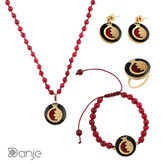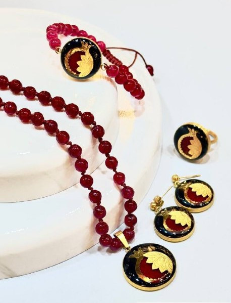 علاوه بر این، سنگ جید سرخ در این ست استفاده شده است. ترکیب جید سرخ با ورق طلا 24 عیار جلوهای بسیار زیبا و منحصر به فرد به این ست داده است که نظر هر فردی را به خود جلب میکند.جنس قالب های به کار رفته در این محصول از استیل 316 میباشد که رنگ ثابت و ضد حساسیت است.