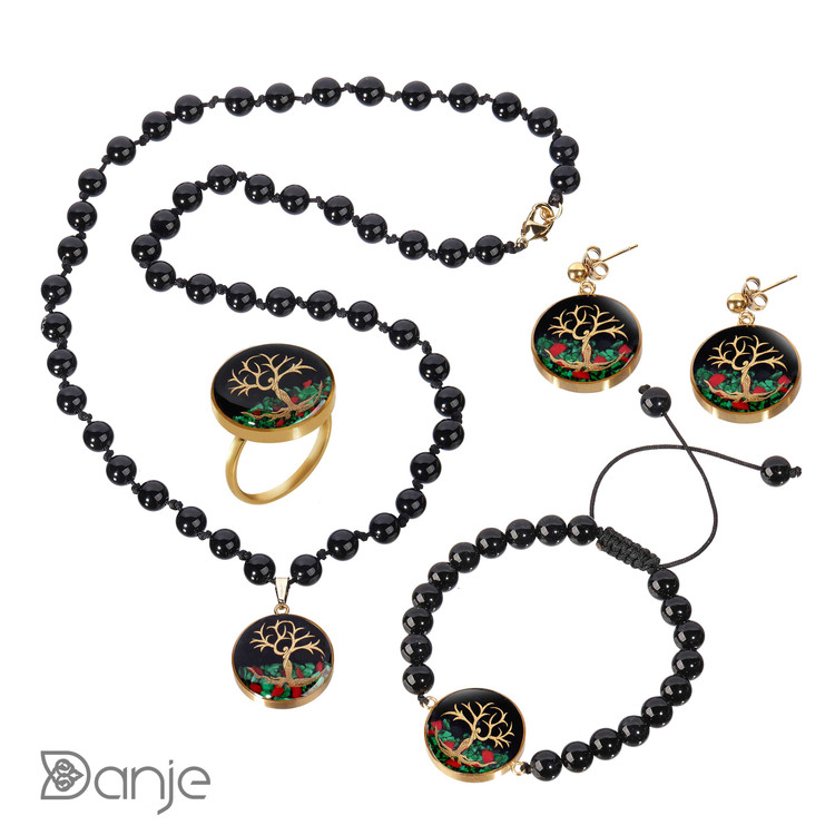 ست درخت زندگی با طرح درخت زندگی و با استفاده از ورق طلای 24 عیار به همراه سنگ اونیکس ساخته شده است. بدنه این ست از جنس استیل ضد حساسیت می باشد که دارای رنگ ثابت است. طرح درون این ست طرح درخت زندگی است که از ورق های نازک طلا 24 عیار ساخته شده اند و بر روی زمینه ای از سنگ اونیکس قرار گرفته است و روی آن برای درخشش و طول عمر بیشتر با یک لایه رزین پوشانده شده است.