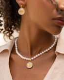 قاب ست پروانه از جنس استیل ضد حساسیت می باشد که دارای رنگ ثابت است. طرح درون این قاب پروانه است که از ورق های نازک طلا 24 عیار ساخته شده اند و بر روی زمینه ای از سنگ صدف قرار گرفته است و روی آن برای درخشش و طول عمر بیشتر با یک لایه رزین پوشانده شده است. بند گردنبند پروانه متناسب با سنگ به کار رفته در درون قاب درست شده است.