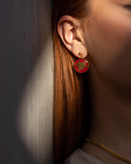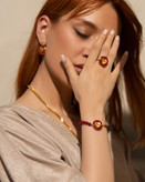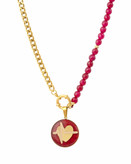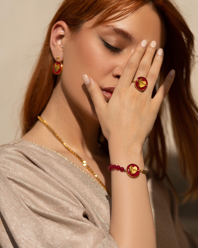 ست ورق طلای ضربان قلب دارای سنگ جید قرمز نیز هست. در واقع قالب اصلی این ست با یک سنگ دایرهای شکل به نام جید قرمز طراحی شده که کاملا طبیعی است. زیبایی این سنگ به دلیل طبیعی و خوش رنگ بودن آن باعث محبوبیت بیشتر این ست ضربان قلب شده است. روی این سنگ جید سرخ نماد ورق طلای قلب و ضربان قلب قرار گرفته است. قلب طراحی شده در این ست حالت مات دارد و روی آن یک ضربان قلب جذاب نیز قرار گرفته است.
