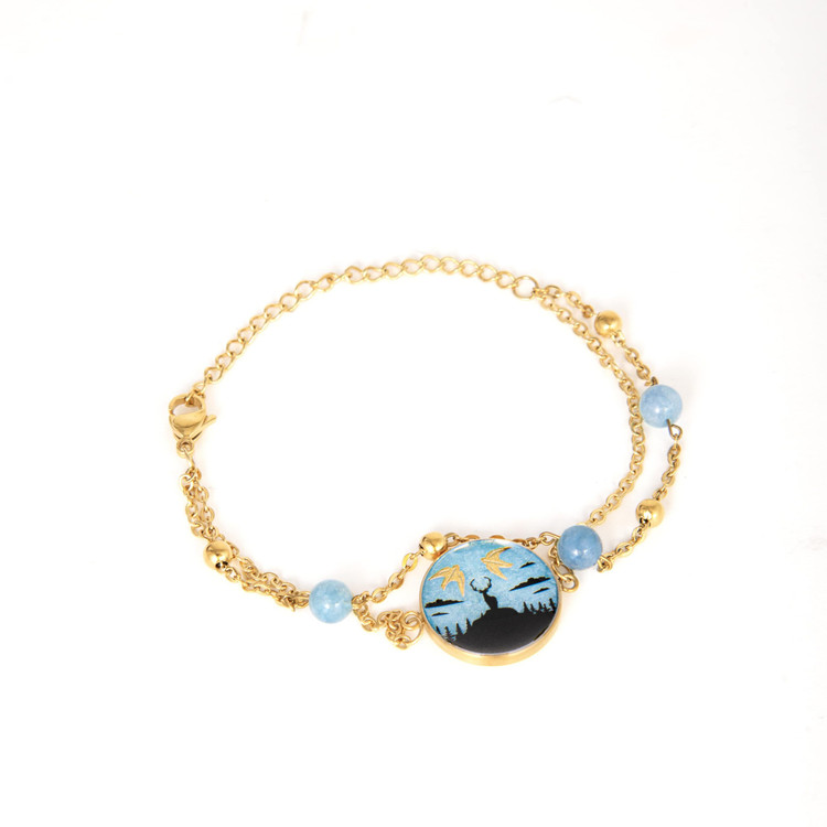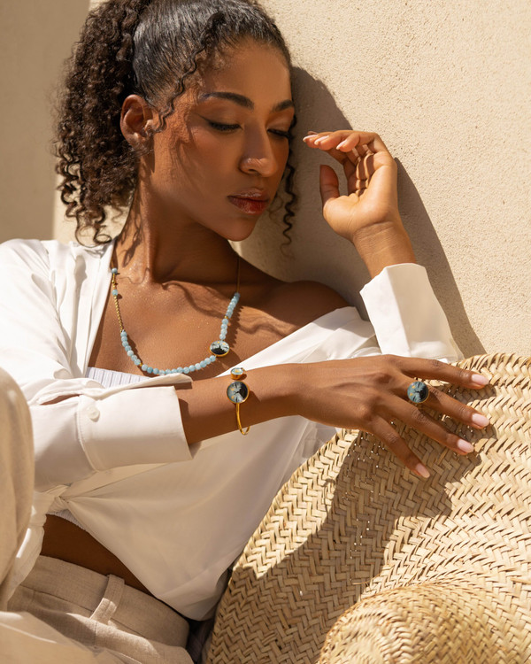 جنس قالب و بدنه این ست ورق طلا و استیل ضد زنگ است. بهترین نوع استیل برای ساخت این ست استفاده شده است تا از نظر تغییر رنگ در اثر گذر زمان خیالتان راحت باشد. به کار رفتن استیل ضد حساسیت در این ست ، عملکرد آن را بهبود بخشیده است. به طوری که همه بانوان، حتی بانوانی که دارای حساسیت به بدلیجات هستند، میتوانند از این ست استفاده کنند. برای زیبایی بیشتر زنجیر استفاده شده برای این محصول، از سنگ جید آبی نیز استفاده شده است که در داخل زنجیر به کار رفته و تضاد زیبایی را را رنگ زنجیر ایجاد کرده است.
