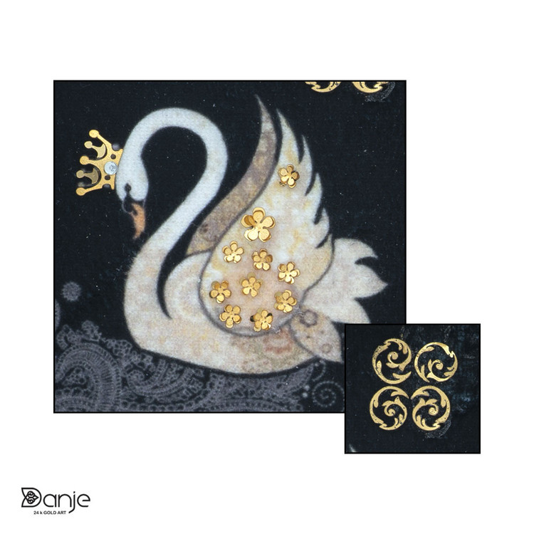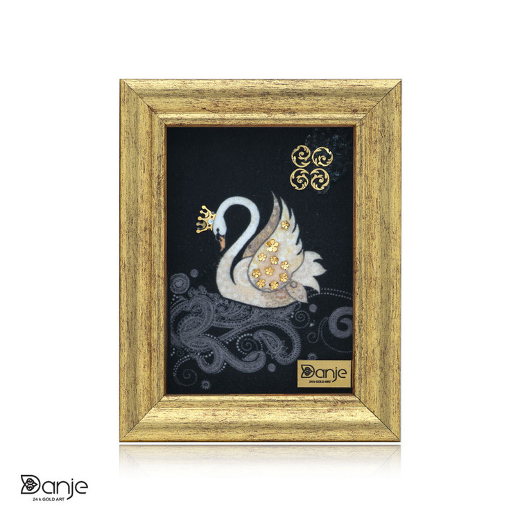 این تابلوي نفیس از ورق طلاي 24عیار داراي گواهی نامه استاندارد از متالوژي رازي به ضخامت 92 میکرومتر که روی یک لایه پلیمر قرار گرفته تولید شده . در این محصول از2 نوع ورق استفاده شده که میزان مساحت ورق طلای مات نازک 1سانتیمتر، ورق طلاي براق 3 سانتیمتر در این کار از تکنیک چاپ روی مخمل استفاده شده .روی بال قو که در تصویر مشاهده می فرمایید می باشد. با گل های مینیاتوری زیبا تزیین شده و تاج روی سرش با ورق طلا کار شده است.