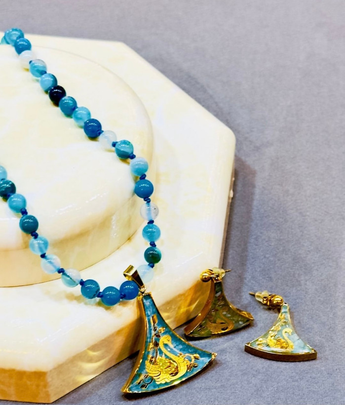 قالب این ست از نوع دامن بولگاری است که همانند نامش دارای طرحی شبیه دامن است و از جنس استیل ضد حساسیت می باشد که دارای رنگ ثابت است. طرح درون این ست قو هستند که از ورق های نازک طلا 24 عیار ساخته شده اند و بر روی زمینه ای از سنگ جید طوسی قرار گرفته است و روی آن برای درخشش و طول عمر بیشتر با یک لایه رزین پوشانده شده است. بند این گردنبند این ست متناسب با درون قاب از سنگ جید طوسی درست شده است. قفل این گردنبند نیز از مدل قفل گره ای بوده که باعث می شود گردنبند به آسانی دور گردن شما بسته شود.